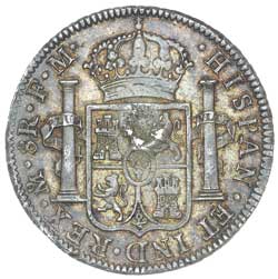 GEORGE III, emergency issue, oval countermarked dollar, on counterfeit Charles IV eight reales Mexico City ...