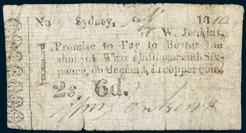 JENKINS, William. No (17) Sydney (July 17) 18(12) W. Jenkins. I Promise to Pay to Bearer the sum of Two Shillings and Six-pence, on demand, in copper coin. 2s. 6d. (Wm Jenkins) (MVR type AW, with guide line vertically between ornaments and text see MVR figure 22 similar for a shilling note, on watermarked ribbed paper, note mentioned in Vort Ronald Colonial Currency & Promissory Notes p.36). Minute "pin holes" and two bottom edge tears on fold lines and tear in left edge, otherwise a full note nearly fine and very rare.