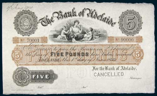 THE BANK OF ADELAIDE, five pounds, Adelaide, 1st June 1893 (date fully printed), printed on paper, numbered No.70001 - 90000, officially perforated CANCELLED, watermarked '5 5 POUNDS BANK OF ADELAIDE' in three lines. Imprint of Bradbury Wilkinson & Co Engravers & C, London, in ink upper left 17th May 1904. (Vort-Ronald p.55 fig 52 similar). Extremely fine, very rare.