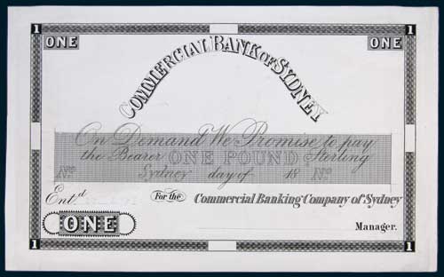 COMMERCIAL BANK OF SYDNEY, type 2, Sydney, one pound uniface partial printer's proof on thick paper, includes frame and all the text details but missing vignettes, text 'Commercial Bank of Sydney On Demand We Promise to pay the Bearer One Pound Sterling, Sydney ...18.., (MVR p.144 for similar complete note illustration, this note as a complete specimen note illustrated in Vort Ronald, Australian Private Banknote Pedigrees p.134). Extremely fine and very rare.