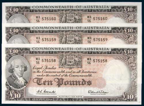 TEN POUNDS, Coombs/Wilson (1960) WA/56 575158/60 (R.63) a consecutive run of three notes. Good extremely fine or better. (3)
