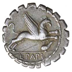 L. PAPIUS, (c.79 B.C.), silver denarius, Rome mint, (3.87 g), obv. Juno Sospita head to right, wearing goat's skin, symbol behind (crater), rev. Gryphon prancing to right, bird symbol below, L PAPI in exergue, (S.311, Cr.384/1, Syd.773, RSC Papia 1). Serrated, slightly off centre, toned, reverse scratch, nearly very fine and very scarce.