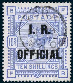 GREAT BRITAIN. Queen Victoria, Inland Revenue, 1890 10/- ultramarine overprinted I. R. OFFICIAL (SG O10), postmarked 'York M.O.O., DE 18 01'. Very fine used, with pencil markings on the back.