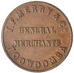 MERRY, T.F., Toowoomba halfpenny, undated (A.368) also penny (A.367). Nearly extremely fine, the first rare in this condition. (2)