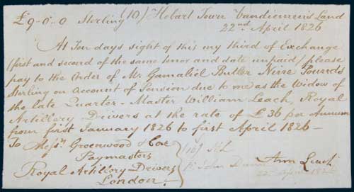 VAN DIEMEN'S LAND, hand written Third of Exchange, £9.0.0 Sterling, Hobart Town, 22nd April 1826,'At ten days sight of this my third of Exchange (first and second unpaid) please pay to the Order of Mr Gamaliel Butler Nine Pounds Sterling on account of pension due to me as the widow of the late Quarter-Master William Leach....' to Paymasters, Royal Artillery Drivers, London signed Ann Leach. Two pin holes, otherwise good very fine.