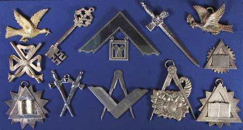 MASONIC LODGE, collar jewels, no ribbons, Grand Officer (2); Treasurer; Past Master; Tyler; Director of Ceremonies; Inner Guard; Craft Lodge Square and Compass; Steward; Chaplain (3, one small and two large). Very fine - extremely fine. (12)