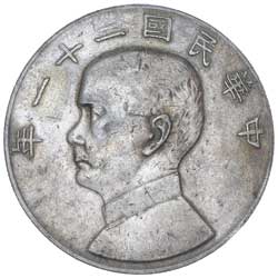 CHINA, Republic, Sun Yat-sen, silver dollar, Yr 21 (1932) birds over junk (KM.Y.344). Extremely fine ...