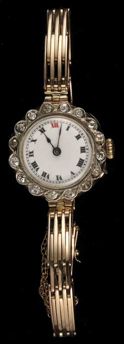 LADIES COCKTAIL WRISTWATCH, Swiss made, c1920s, in 9ct rose gold (total weight 31.6g), 28mm head, white enamel dial, with roman numeral markers, manual wind, set with sixteen old cut diamonds, spring link 9ct gold bracelet with safety chain. In going order but canot be guaranteed for accuracy, bracelet with only partial stretching ability.