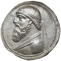 PARTHIA, Kingdom of, Mithradates II, (c. 128-88 B.C.), silver tetradrachm, (15.55 g), Seleucia mint, obv. bearded bust to left in diadem, dotted border, rev. archer seated right on omphalos, four line inscription, palm branch to right, **BASILEWS ARS AKOU EPIFANOUS MEGALOU*, TV in exergue, (S.7365, Sellwood 24.4, BMC 3 [p.23], Shore 67). Extremely fine, rare.