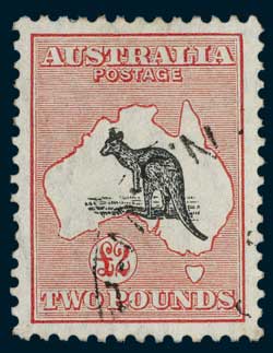 AUSTRALIA, 1/2d - £2 kangaroo set, some mint stuck on album leaf, noted £2 C of A wmk. fine used (see illustration); £1 chocolate and blue 3rd wmk. (illustrated); £1 grey 3rd wmk. (illustrated), 10/- C of A wmk. (illustrated), 5/- C of A wmk. mint, (illustrated); others mint and used, including 2/- 3rd wmk fine mint, OS O/P etc., several issues with faults. Mint and used. (38)