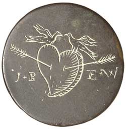 LOVE TOKEN, Great Britain George I halfpenny (1719-24) smoothed and on reverse is engraved a heart with two love doves sitting atop and kissing, with arrows piercing the heart left and right and at the sides the initials, 'J + B' at the left and 'E + W' at the right. Very fine.