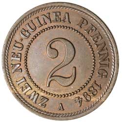 GERMAN NEW GUINEA, two pfennig, 1894A. Brown with traces of red, nearly uncirculated.
