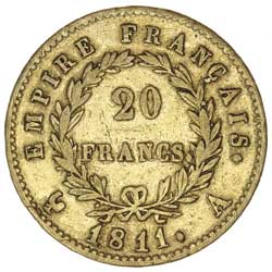 FRANCE, Napoleon Emperor, twenty francs, 1811A (KM.695.1). Very fine.