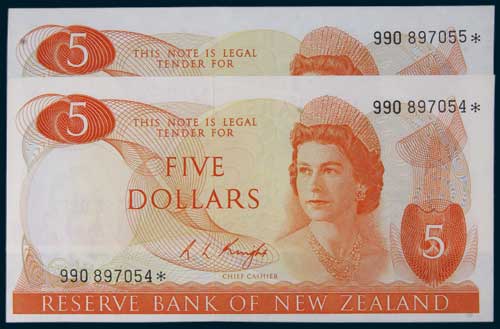 RESERVE BANK OF NEW ZEALAND, R.L.Knight (1975-77), five dollars star replacement notes, 990 897054*/5* consecutive ...