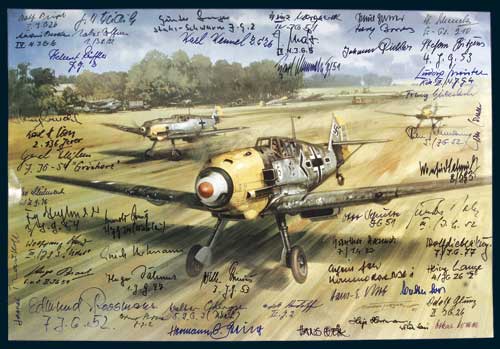 LUFTWAFFE ACES SIGNATURES, in blue and black felt tip on a colour glossy photo (approx 44x30cm) of three ME 109s taking off, with nearly 50 Luftwaffe aces' signatures with many adding the number of victories, includes Martin Becker, Hans-Ekkehard Bob, Adolf Borchers, Hugo Broch, Willi Crinius, Hugo Dahmer, Arnold Doring, Peter Duttmann, Franz Eisenach, Heinz Ewald, Wolfgang Ewald, Adolf Glunz, Hermann Greiner, Gunther Hannak, Erich Hartmann, Hajo Herrmann, Jans Joachim Jabs, Wolf-Dietrich Huy, Wilhelm Johnen, Karl Kennel, Josef Kraft, Heinz Lange, Karl Lion, Stefan Litjens, Walter Loos, Heinz Marquardt, Ludwig Meister, Walter Ohlrogge, Johannes Pichler, Rolf Pingel, Gunther Rall, Karl Rammelt, Oskar Romm, Edmund Rossman, Erich Rudorffer, Helmut Ruffler, Wolfgang Schenck, Winfrid Schmidt, Leo Schuhmacher, Otto Schultz, Gunther Seeger, Bruno Stolle, Fritz Tegtmeier, Gerhard Thyben, Hannes Trautloft, Hans Weik, Franz Woiditch, Walter Wolfrum, and Paul Zorner. A few mild dings, otherwise fine condition.
