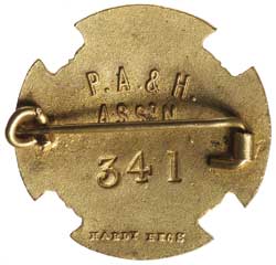 DUBBO DIAMOND JUBILEE SHOW, 1933, pin back badge in enamel and gilt bronze, by Hardy Bros, reverse, in relief, 'P.A.& H./Ass'n' and impressed number 341. Nearly extremely fine.