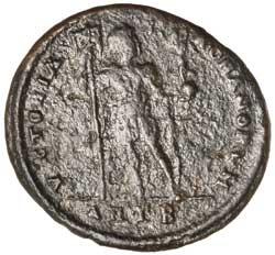 JOVIAN, (A.D. 363-364), AE double maiorina, Antioch mint, issued 363-4, (7.27 g), obv. laureate draped and cuirassed bust to right, around D N IOVIANV S P F P P AVG, rev. VICTORIA ROMANORVM around, ANTB. in exergue, emperor in military dress standing facing head right, holding standard with chi-rho on banner and Victory on globe, (S.19215, RIC VII 228). Rough surface, otherwise good fine and rare.