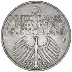 GERMANY, Federal Republic, silver five mark, 1952D Centenary Nurnberg Museum (KM.113). Brushmarks, otherwise extremely fine ...