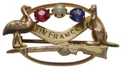 SWEETHEART BADGE, in gold (9ct, 3gm, 35mm x 21mm) 'In France' engraved on boomerang in centre, emu and kangaroo either side, rifle below. Very fine.