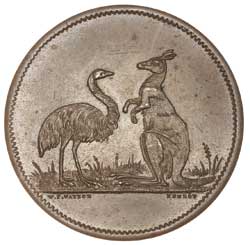 HALL, Henry J., Christchurch kangaroo and emu mule penny, undated (A.160). Brown with traces of red, uncirculated and very rare.