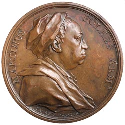 MARTIN FOLKES, 1740, (antiquarian and scientist), in bronze (54mm), by J.Dassier, obv. bust facing right, rev. legend in ornamental device, (Eimer 556; MI.558/185). Extremely fine.