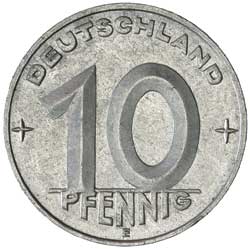 GERMANY, Democratic Republic, ten pfennig, 1953E (KM.7). Mint bloom uncirculated and very scarce.