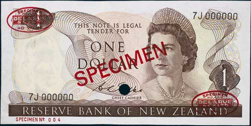 RESERVE BANK OF NEW ZEALAND, D.L.Wilks (1968-75), specimen one dollar, 7J 000000, SPECIMEN in red diagonally and de la Rue red specimen lozenges top left and bottom right corners, front and back, one punch hole cancellation at bottom, SPECIMEN No. 004 in bottom margin (P.163b). Paste remnants on back at right, otherwise uncirculated and very rare.