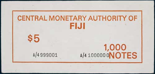 Together with a printed card 'batch cover' for 1,000 $5 notes, A/4 999001 - A/4 1000000. Obtained by the owner while working as a bank teller in Fiji in 1974.