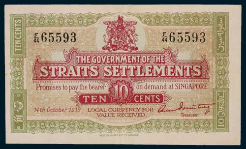 STRAITS SETTLEMENTS, The Government of the Straits Settlements, ten cents, 14th October 1919, F/44 65593 (P.8b). Good very fine and rare.