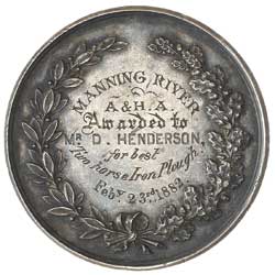 MANNING RIVER A(GRICULTURAL) & H(ORTICULTURAL). A(ssociation)., undated (1882), in silver (45mm), by Evan Jones/9 & 11 Hunter St/Sydney, inscribed on reverse, 'Awarded to/Mr. D.Henderson/for best/Two horse Iron Plough/Feby 23rd 1882'. Toned, good very fine and rare.