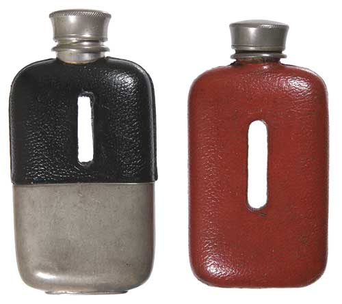 PEWTER HIP FLASKS, one wrapped in black leather with pewter screw top, cork still intact on lid, the other wrapped in red leather with pewter screw top, cork is deteriorated, both with viewing glass. In good condition. (2)
