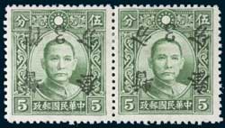 red spring back album with 182 album pages, contains a study collection of 100s of the issue of the 4c on 5c Sun Yat Sen 1940-1 issues printed in Hong Kong with surcharge in red, (SG 582) includes imprint blocks, large blocks 7xhalf sheets etc, mostly MUH, mint with a few used; includes in a block of 9, 12, 25 and 2x50 the variety 'Tso-Tso' error on O/P (SG 582a [£150]) also a used example, another missing 'fun' in a block of 9, unlisted, double surcharges; imperf at bottom vertical pair 3c on 5c Chekiang surcharge (SG 581ax), others with black surcharges from Shanghai, Eastern Szechuan, Kiangsi, Kansu, Hunan and some with bogus surcharges including a used pair with O/P inverted; Shanghai surcharges blocks, include imprints, part sheets, used in blocks, offsets, shades (SG 576, 578, 580, 581); Eastern Szechuan similar (SG 579b, 581b) with 1st and 2nd settings, includes pairs and singles of double surcharge (SG 579ba £180), several block of 9 with partial missing surcharges, another with inverted O/P pair with the 'fun-fun' error (SG 581ba repeat of character £275. but not inverted unlisted) (illustrated); character varieties in block, block with MUH 'fun-fun' variety (SG 581ba), others with smaller 3, another in block with top character missing (SG 579bc £350), some with missing surcharges or added to margin; a large block of 28 with missing 'tso' but added later by hand, similar for block of 42, 18th stamp with character 3 missing added by hand later, others in large blocks with broken characters; various printings noted; Kansu similar blocks and varieties including printings, small 3; double surcharges, surcharge variations in large imprint blocks used, inverted surcharges four blocks of 4 (2 normal, 2 inverted) (one block illustrated with imprint) also used and blocks of mint and used with inverted surcharges, pair with and without O/P; replacement letters in blocks; Kansu unlisted types 3c on 2c green and 3c on 15c red; Chekiang, similar to other provinces above, surcharged 3c on 5c in red, various imprint blocks (a few described as forged surcharges); Kiangsi, a similar selection, singles, blocks, imprints, part sheets, half sheets, varieties of O/P (partial missing characters), these noted on sheets, includes four double 'fun' errors centre stamp in blocks of 9 (SG 579aa £275), used with characters missing etc; Hunan surcharges, similar to above, blocks, singles, MUH, used, etc. An extraordinary accumulation written up 60 years ago by a specialist, some original items previously removed, but appears to be a unique collection on about 182 pages. MUH, mint and used. (1,000s)