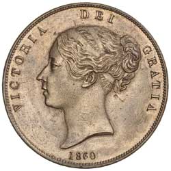 QUEEN VICTORIA, young head, copper penny, 1860/59 overdate (S.3948). Has been cleaned, now retoning, good extremely fine and very rare.