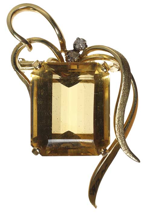 FASHIONABLE BROOCH, in 18ct gold with large central citrine (approx 15x18mm), above two small diamonds and thin, wispy sprays around (tot wt 12.02g). Extremely fine.