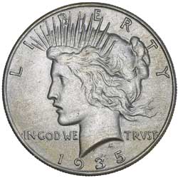 USA, PEACE DOLLAR, 1935S. Golden tone lower portion of obverse, upper of reverse, uncirculated.
