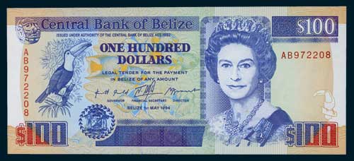 BELIZE, Central Bank of Belize, Elizabeth II, one hundred dollars, 1st May 1994, AB 972208 ...