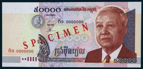 CAMBODIA, National Bank of Cambodia, 2001 issue, five thousand, ten thousand and fifty thousand riels, all with prefixes and numbered 0000000, SPECIMEN in red diagonally both sides (P.55s, 56s, 57s). Uncirculated. (3)