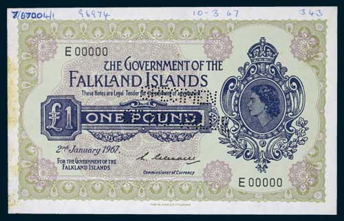 FALKLAND ISLANDS, The Government of the Falkland Islands, Elizabeth II, specimen one pound, 2nd January 1967, E 00000, imprint of Thos de la Rue & Co Ltd, London, SPECIMEN/OF NO VALUE perforated in centre, printer's instructions '7/07004/1-96974-10.3.67-343' penned in top margin (P.8as). Remnants of glue on front left and back right, good extremely fine.
