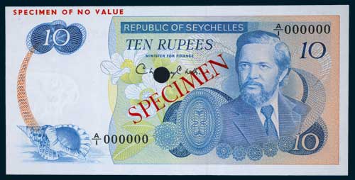 SEYCHELLES, Republic of Seychelles, specimen ten rupees, undated (1976), A/1 000000, SPECIMEN in red diagonally both sides, SPECIMEN OF NO VALUE in red top left margin on front, single punch hole cancellation at signature, numbered 073 in top left margin on back (P.19s). Uncirculated.