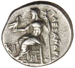 MACEDON, Kingdom of, Alexander III, (336-323 B.C.), silver drachm, (4.18 g), Lampsacus mint, issued c.310-301 B.C., obv. head of Herakles to right wearing lion skin with dotted border, rev. Zeus seated on throne to left, eagle in outstretched hand, KI to left, ME monogram below throne, to right **ALEXANDRO[U]*. (cf.S.6730, Price 1406, BMC 1406a-h, M.821, SNG Cop.988). Bright, nearly extremely fine, scarce.
