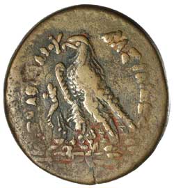 EGYPT, Kingdom of, Ptolemy IV, (221-204 B.C.), AE 32, hemidrachm, (36.06 g), Alexandria mint, obv. diademed head of Zeus Ammon to right, rev. eagle to left with closed wings, standing on thunderbolt, cornucopiae to left, around **BASILEWS PTOLEMAIOU, between legs **LI*, dotted border, (cf.S.7843, Sv.1128, SNG Milan 213-3, SNG Cop. 219, Pitchfork 51, Koln 52 [attributes issue to Ptolemy II between 253-249 B.C.). Very fine and rare.