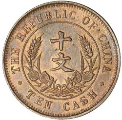 CHINA, Republic, copper ten cash, mostly c.1912 with obverse of two flags, (KM.Y.301, 302, 302.2, 303 (with mint red illustrated), 303.1, 303.3, 303.4, 305, 306.1, 306.4, 307, 307a, 309); twenty cash 1921 (2) (KM.Y.308a, 310) (310 illustrated); other types one cent with central hole c.1918 (KM.Y.324, 324a), similar half cent (KM.Y.323); copper two cents 1933 (KM.Y.325a) (illustrated). A good range of types for this period. Nearly very fine - nearly uncirculated. (19)