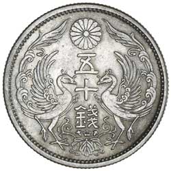 JAPAN, Meiji, silver fifty sen year 37 (1904) (KM.Y.25) (illustrated); Taisho, another year 4 (1915) ...