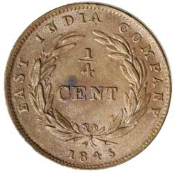STRAITS SETTLEMENTS, East India Company, quarter cent 1845 (KM.1). Uncirculated with light brown patination.