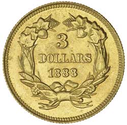 USA, THREE DOLLARS, 1888, Indian princess head. Nearly uncirculated, rare in this condition (MS62).