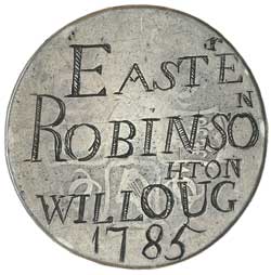 CHARLES II, crown, love token, third bust, [1676] OCTAVO edge, obverse engraved with a rose, shamrock and thistle with ribbon at base, reverse smoothed and engraved 'Easter/Robinson/Willoughton/1785'. Engraving very fine, host coin poor.