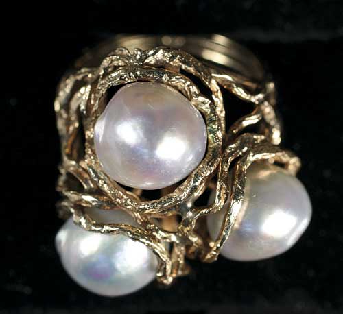 PEARL RING, in 14ct gold, features three natural grey pearls in a complex voided setting (tot wt 9g). In Asahi Pearls, Asahi Shoten, Tokyo case, good extremely fine.
