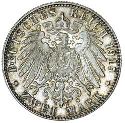 GERMANY, Saxe-Meiningen, Georg II, (1866-1914), silver two mark 1915, commemorative of death of Georg II, (KM.206). Light peripheral patination, uncirculated and scarce.