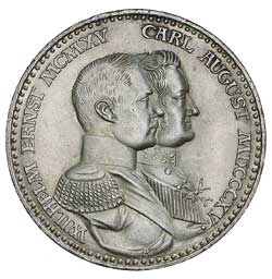GERMANY, Saxe-Weimar-Eisenach, Wilhelm Ernest, three mark, Centenary of Grand Duchy, 1915A, (KM.Y.177). Brilliant uncirculated and scarce.
