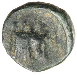 Physical comparison with a rare bronze issue of Thurium (BMC 140) has shown that this coin does not belong there. This Herakles is older, bearded and has much in common with the early Karystos drachms (see nos. 552 and 553 of this catalogue). Also, the sacrificial fillets are clear on this coin but absent on the Thurium coin. On the other hand, the bent foreleg of the animal in profile is clear on the South Italian coin but not present here. However, there is some similarity to the earliest small bronzes of the League (see catalogue nos. 39 and 40). An important early Karystos bronze, probably the earliest of the city. This example has perhaps the clearest ethnic of the few known specimens.
